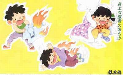 千万别乱跑;脱去着火衣服,就地打滚,用湿被捂盖或用水灭火