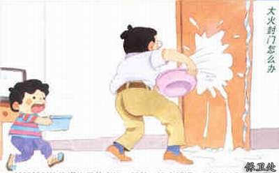 关闭并封堵连通火区的房门、缝隙,泼水降温,呼救待援