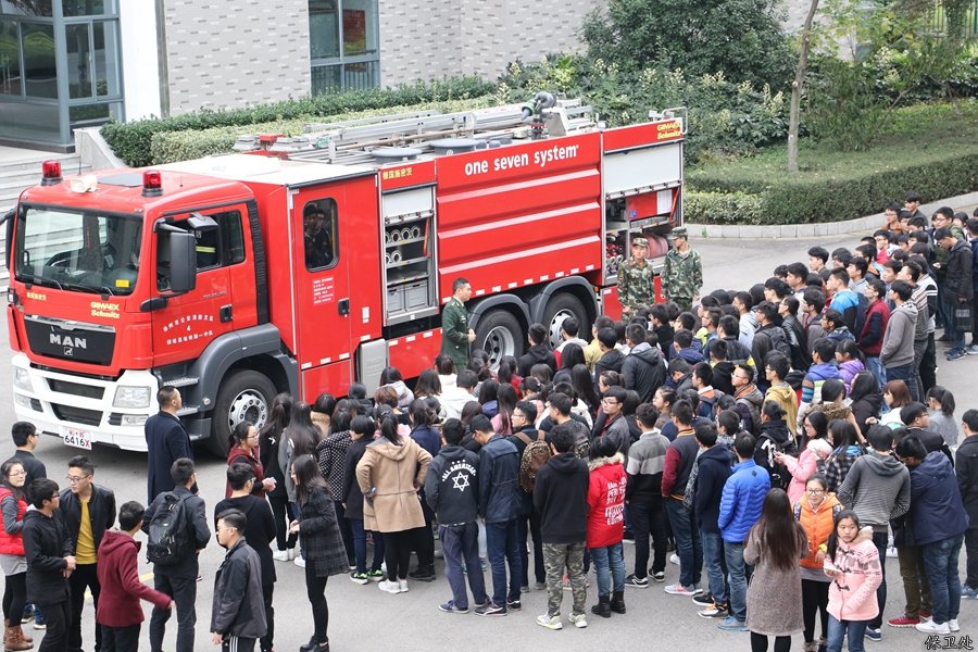市消防支队李队长带队消防官兵5人,出动消防车一辆。14:30分在敬德楼B201教室举行了消防知识讲座,讲座结束后同学们来到室外操场,李队长向同学们讲解了灭火器的原理,基本操作方法及注意事项。同学们在认真听讲及观摩后,亲自体验了现场灭火的过程,面对熊熊燃烧的火堆,同学们表现积极勇敢,按照灭火的步骤和方法将火焰迅速扑灭。