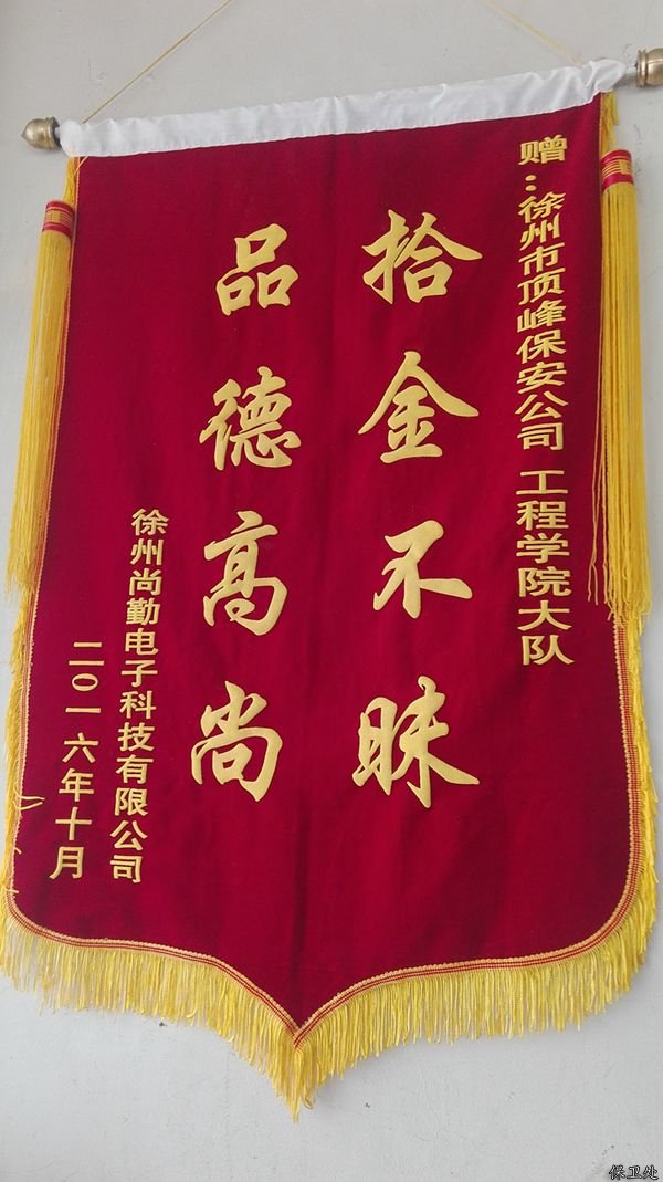10月10日晚上原来园校区保安队员外围巡逻时,在操场栏杆发现一个黄色公文包,内有笔记本电脑一台。队员及时上交到当班孔队长手里,孔队长发现公文包内有一张名片并予以联系。10月11日早上8点多失主赶到学校,孔队当面把失主丢失物品归还,对方非常感激,声称电脑内的资料对他很重要,为了表示感谢,失主送来锦旗一面。