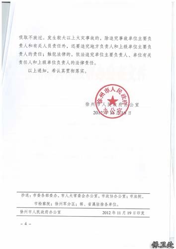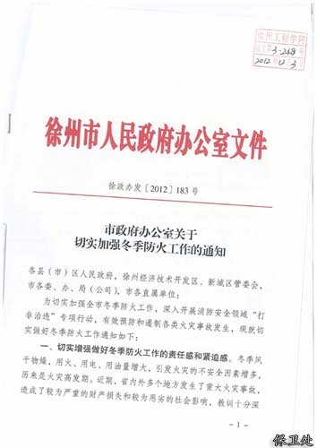 现将徐州市政府办公室下发的《市政府办公室关于切实加强冬季防火工作的通知》(徐政办发[2012]183号)转发给你们,希望各单位按照通知要求,认真分析研究本单位冬季防火工作中存在的突出问题,制定针对性的有效措施,开展安全自查隐患自改工作,坚决遏制火灾事故的发生,为学校稳定发展创造良好的消防安全环境。