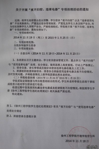 宿舍是同学们另一个家,为了积极响应学生处宿管办关于公寓区的安全预警,落实我院“三位一体”宿舍建设公工程,保护同学们的人身财产安全,近日,环境工程学院开展公寓区“夜不归宿、违章电器”冬季专项治理活动。