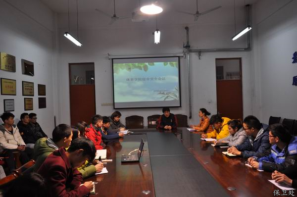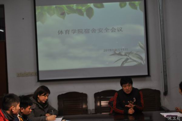3月11日下午3点30,体育学院在体育馆一楼会议室召开了新学期宿舍安全教育会议。体育学院分管学生工作副院长陈益群、学生科科长唐荣红、辅导员张蕾老师以及体育学院学生会宿管部干部、各班主要学生干部、各宿舍室长参加了会议。