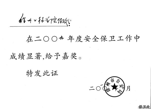 我校保卫处在2009年的安全保卫工作中,坚持“预防为主、加强防范、确保安全”的原则,服务学校中心工作,认真开展调查研究,狠抓保卫队伍建设,积极做好校园安全防范,及时处置突发案事件,配合公安机关加大校园环境整治力度,全年可防性案件发案率为零,成绩突出,维护了学校的安全与稳定。经徐州市公安局高校安全保卫工作检查考核领导小组考核验收,我校保卫处荣获09年度安全保卫工作集体嘉奖。