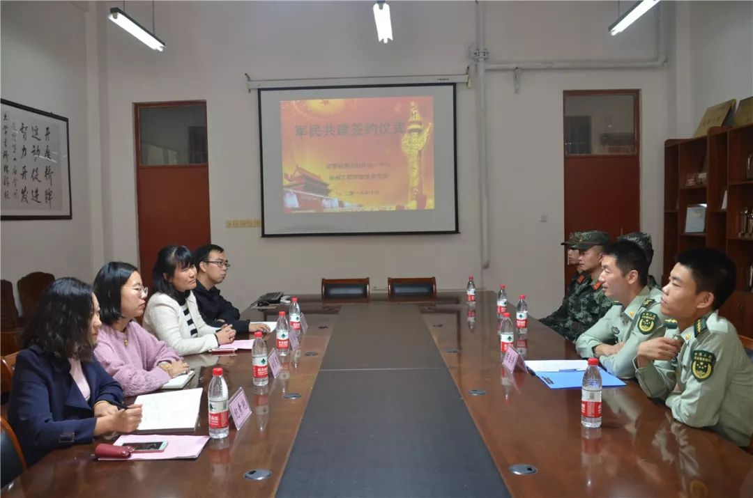 近日,徐州工程学院体育学院与武警徐州支队机动一中队军民共建合作签约仪式在体育学院会议室举行。武警徐州支队党委委员、纪委副书记、团委书记、政治工作处副主任陈金涛,校团委副书记郝景亚、体育学院党总支副书记吕楠,学生科副科长纪素艳、辅导员曹鎏共同出席签约仪式。